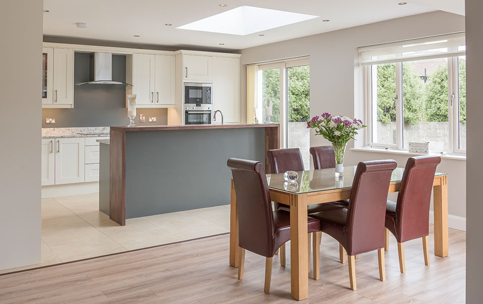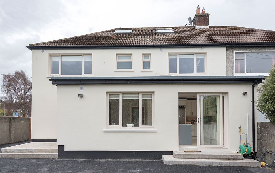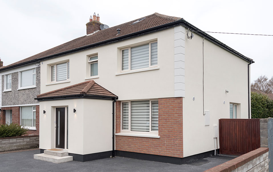 This corner site semi-detached home was ‘gutted’. Walls were knocked through, bathrooms remodeled, wiring was replaced, plastering, painting, plumbing and heating system installed, external insulation and rendering and the wow factor – a beautiful open plan kitchen / living / playroom area was created.